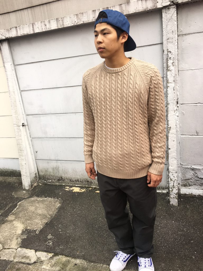 ケーブルニットにチノパンの合わせ方ですが色味や素材の違いで