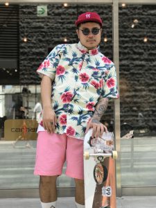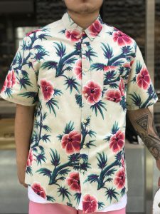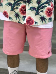 HUFのボタンアップのアロハシャツにFTCのピンクのナイロンショーツ