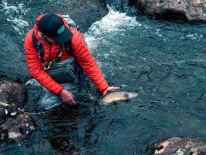 ダウンにバッグを背負って川に入り魚を手づかみ完全にスタイルですよね!