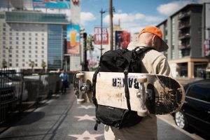 これは有名なスケーターなんですけどなんとバックパックにデッキぶっ刺してます!