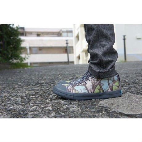 今回のモデルは、「戦争のため」、「動物を殺すため」のカモフラージュ柄ではなく、「自然との調和」、「平和のため」のカモフラージュ柄、「PEACE CAMO(horn tree)」をテキスタイルグラフィックとして表現しています。