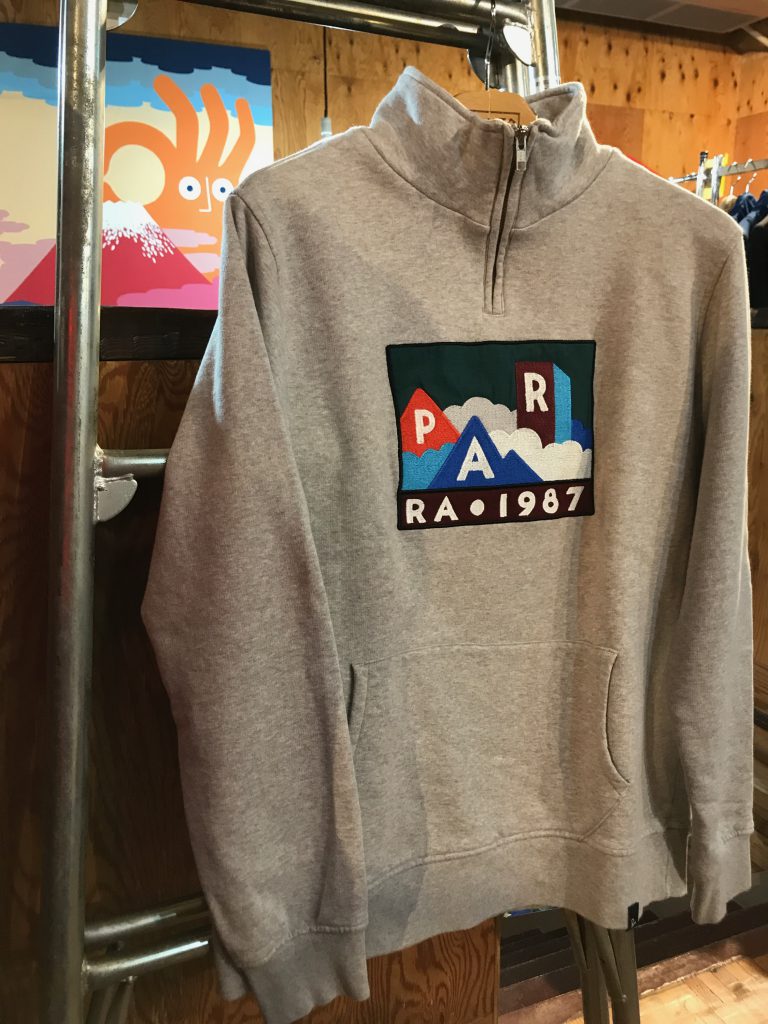 クォータージップのプルオーバースウェットのフロントに”MOUNTAIN OF 1987″のパッチが刺繍で配置されたモデル。