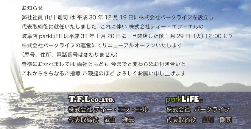 現在、株式会社ティーエフエルにて運営中のパークライフ は1月20日 日曜日で一旦閉店し、1月29日火曜日12時に株式会社パークライフの運営にて、再スタートとなります。(屋号、住所、電話番号などは変わりません。)